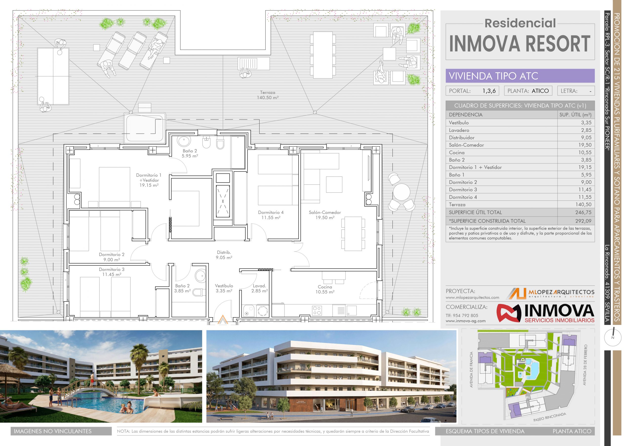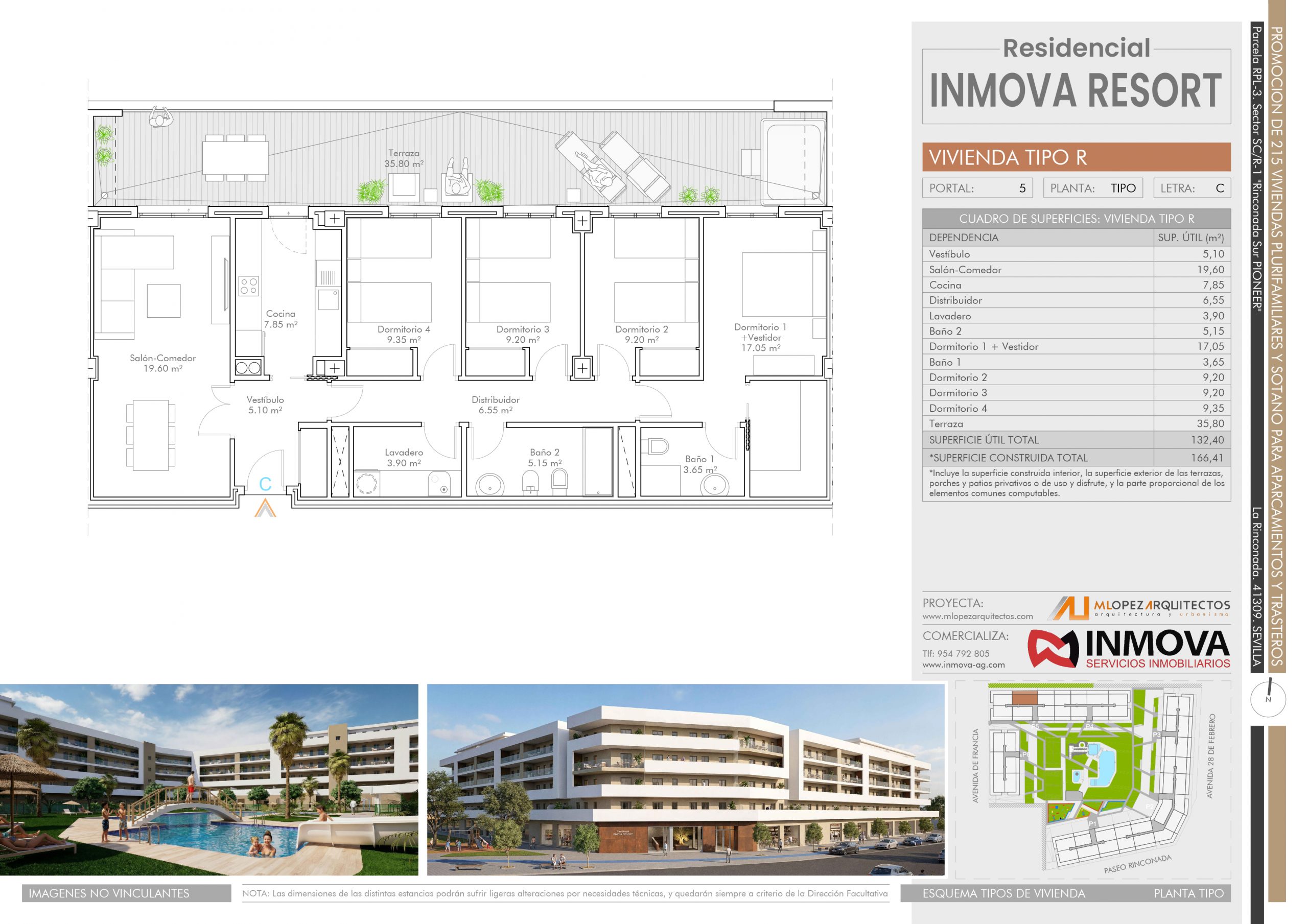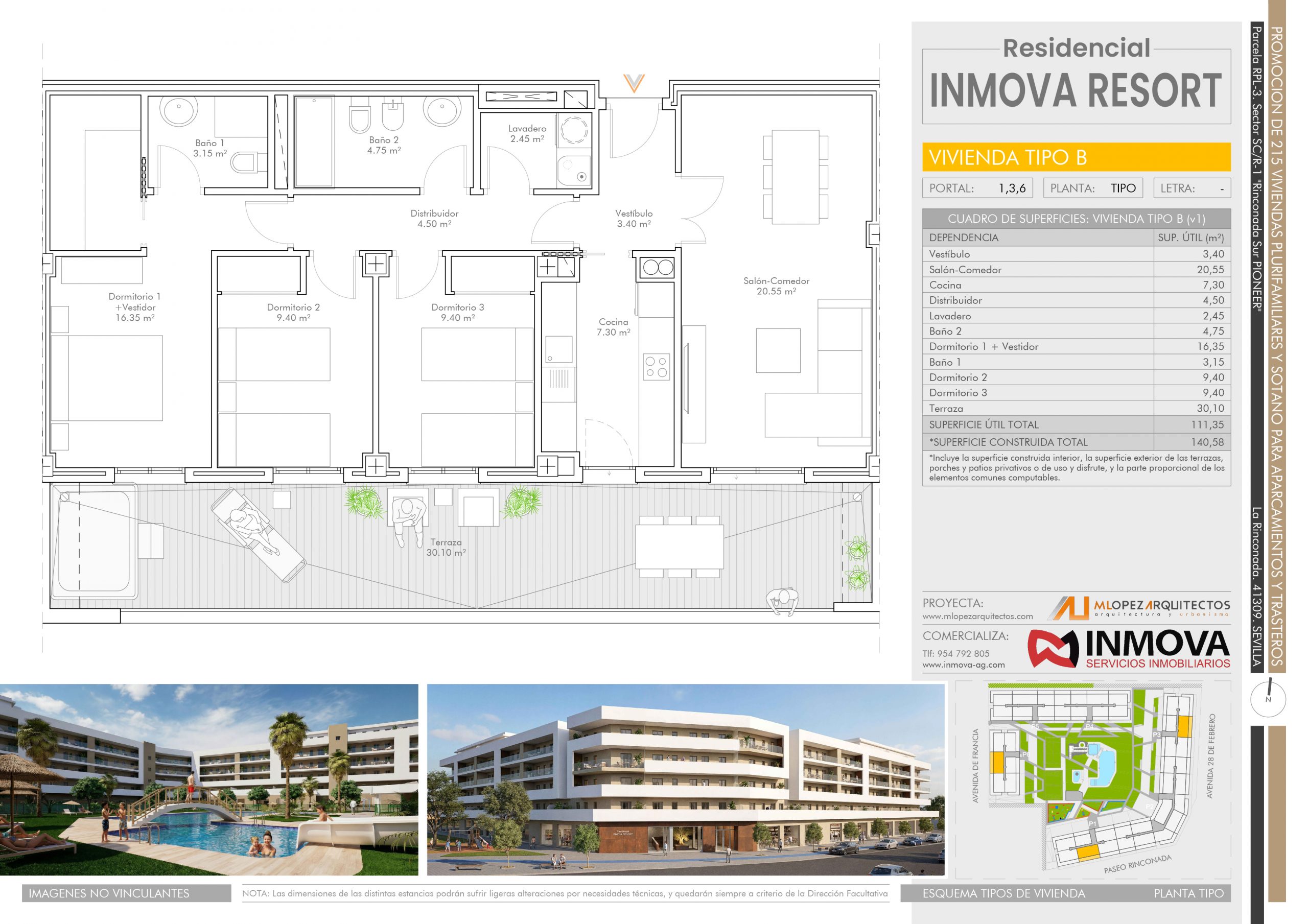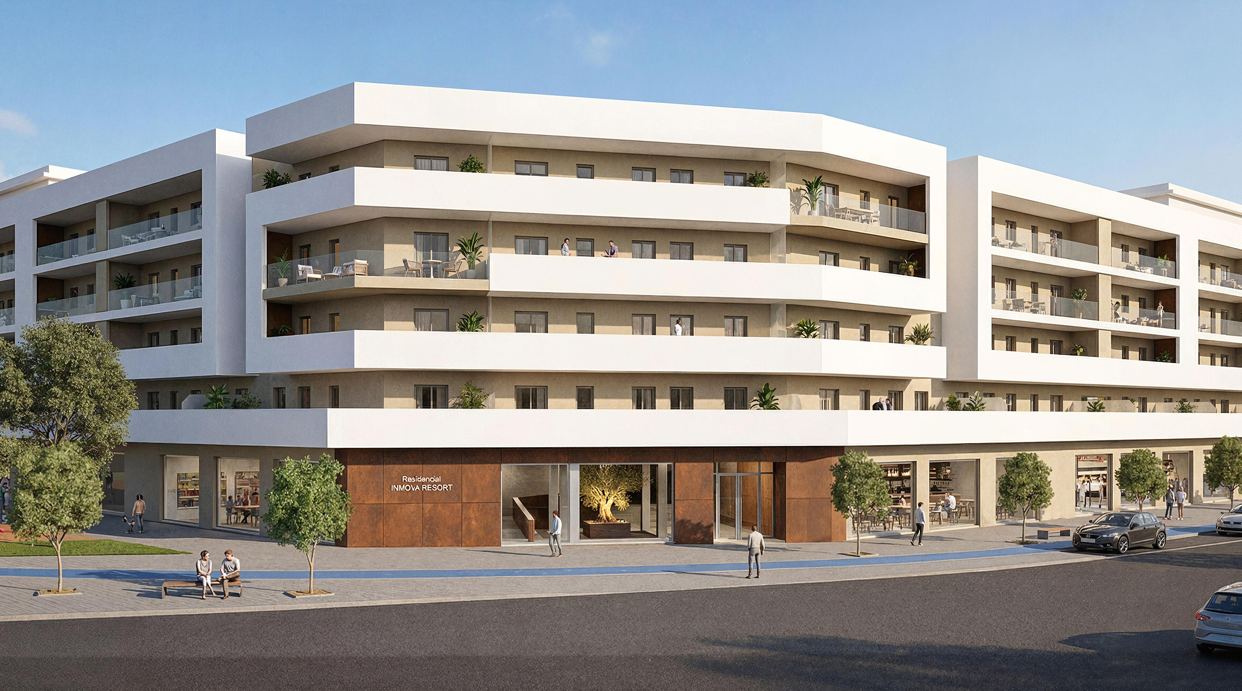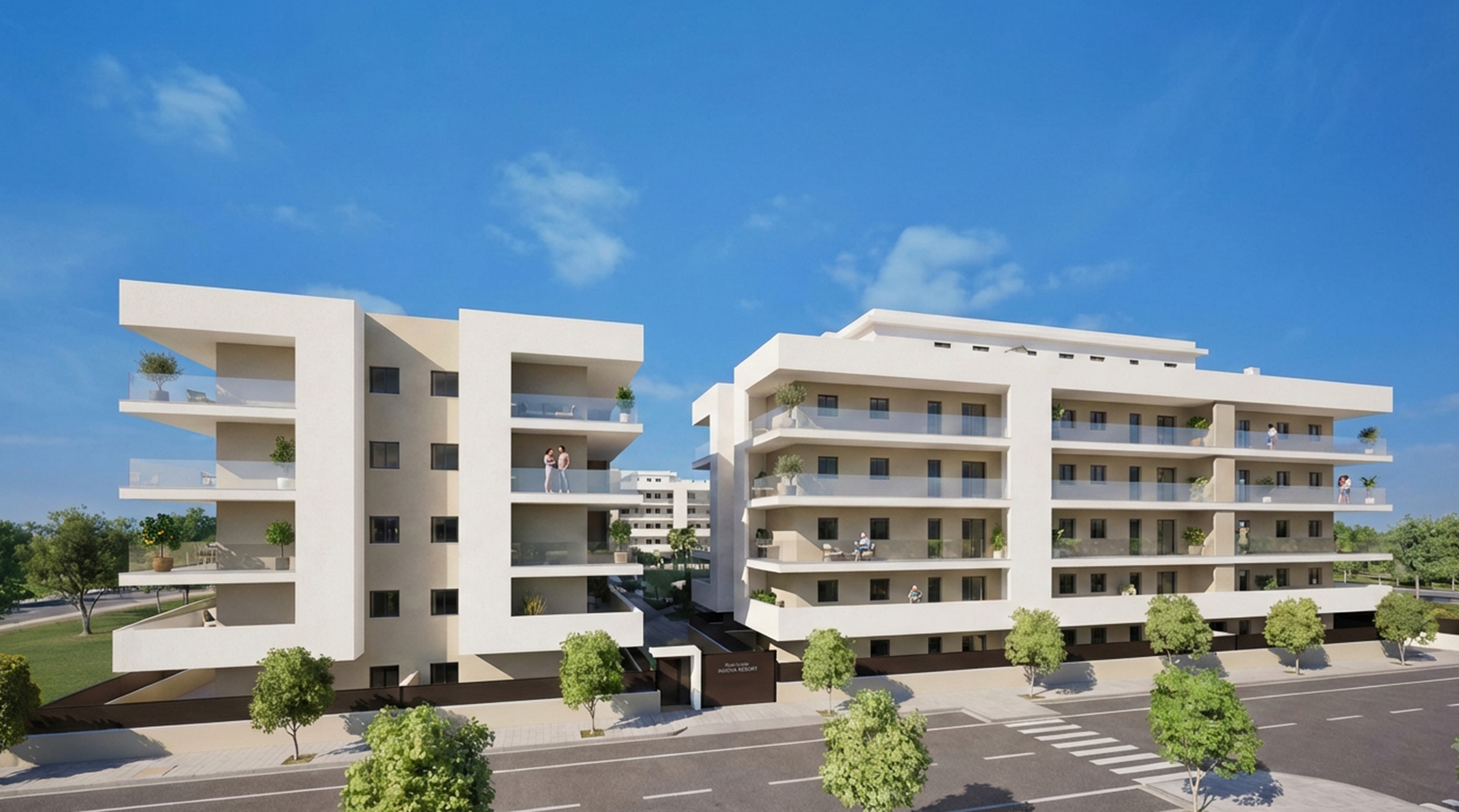 Nos satisface presentaros la nueva promoción Residencial INMOVA RESORT, un complejo urbanístico privado con parcela de 14.086m2, compuesto de 217 viviendas plurifamiliares, viviendas desde 1 dormitorio a 4, con dormitorio principal tipo suite con baño y grandes terrazas exteriores con ZONA DE JACUZZI.