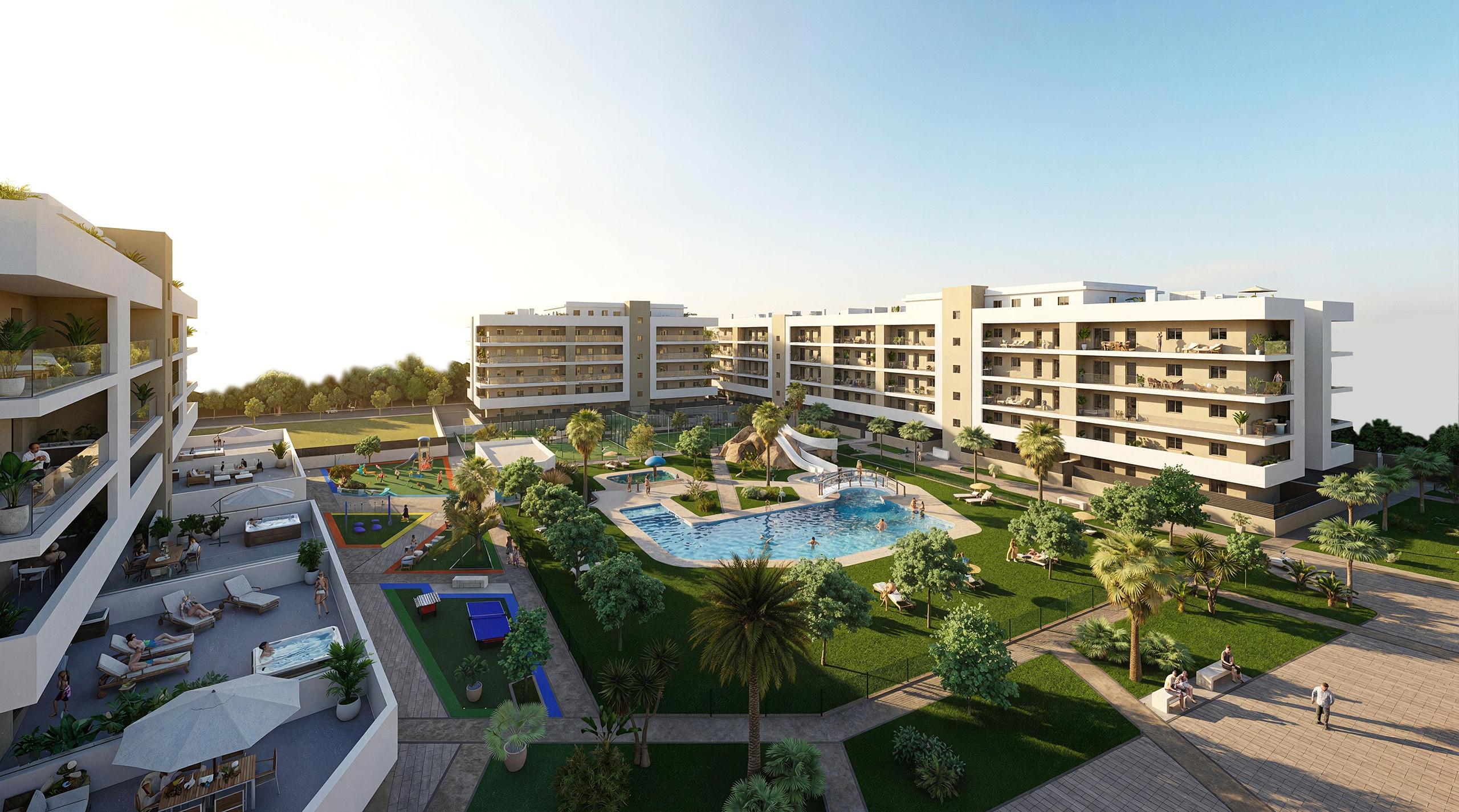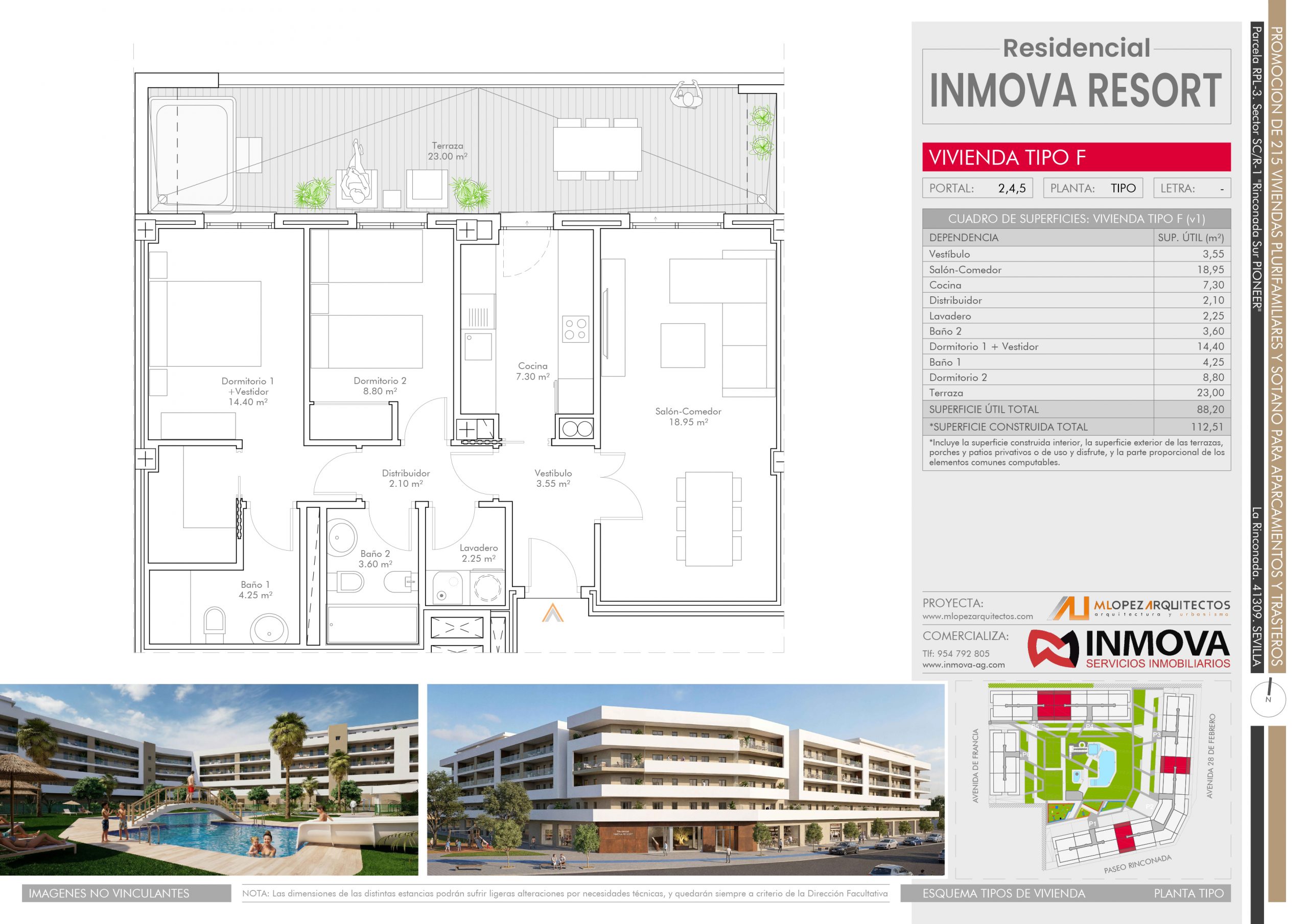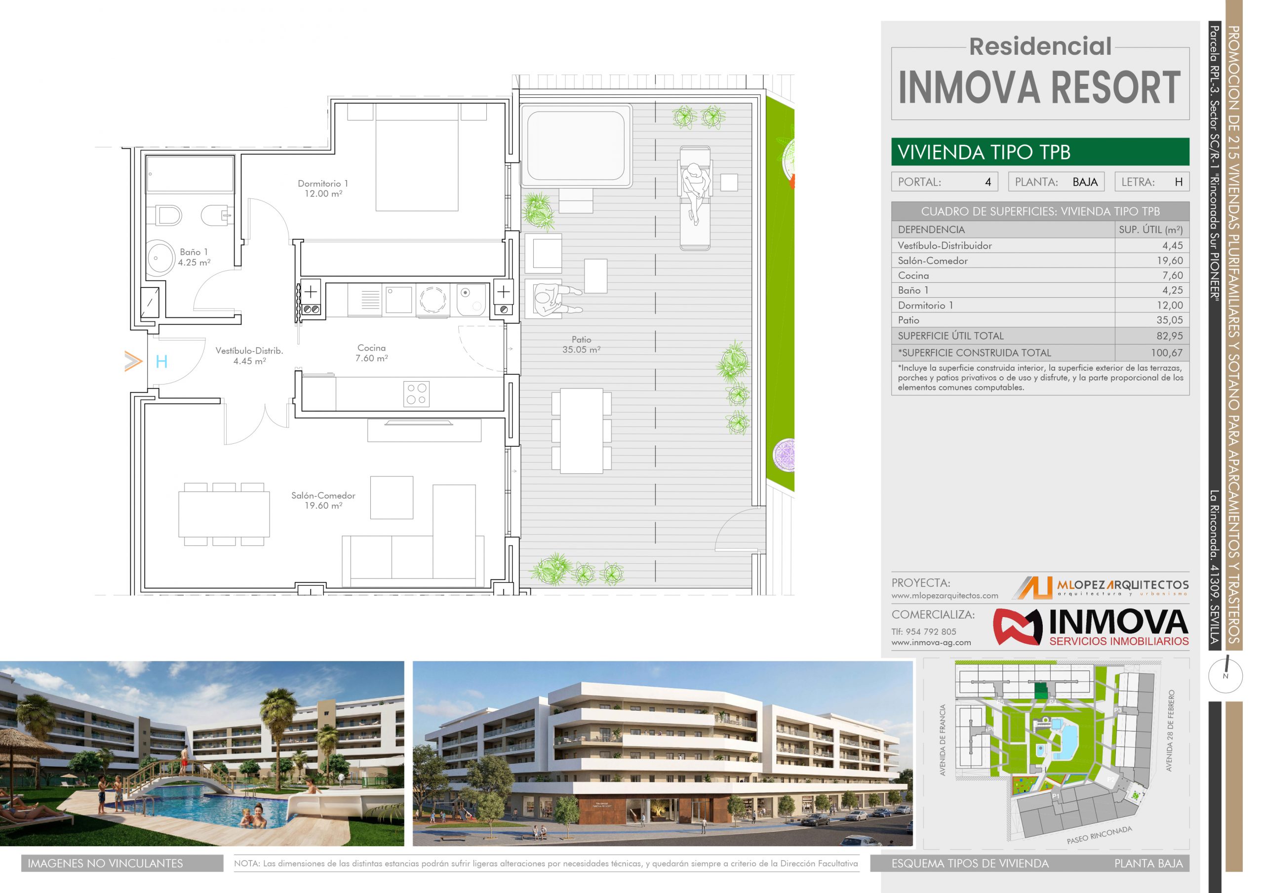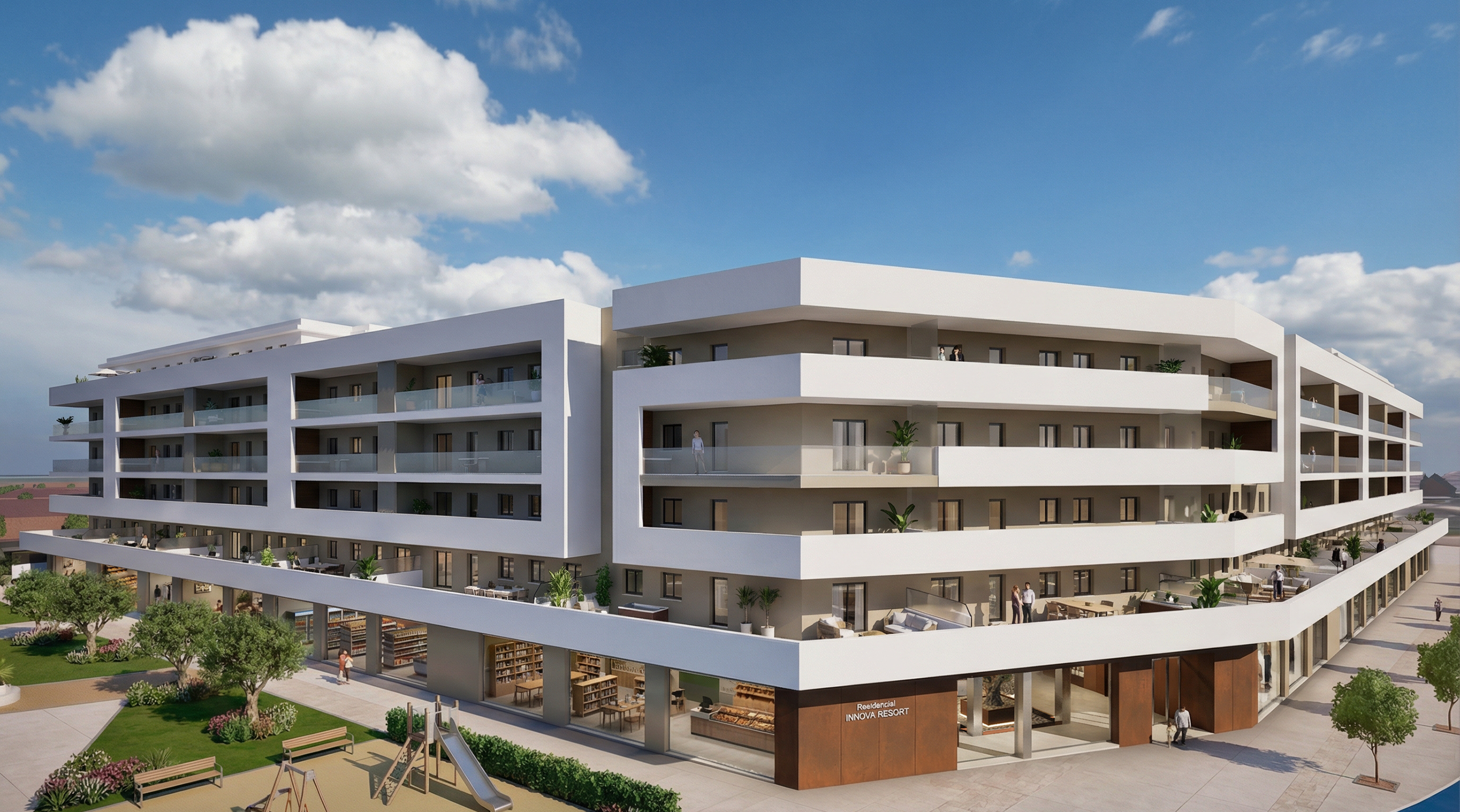 Nos satisface presentaros la nueva promoción Residencial INMOVA RESORT, un complejo urbanístico privado con parcela de 14.086m2, compuesto de 217 viviendas plurifamiliares, viviendas desde 1 dormitorio a 4, con dormitorio principal tipo suite con baño y grandes terrazas exteriores con ZONA DE JACUZZI.