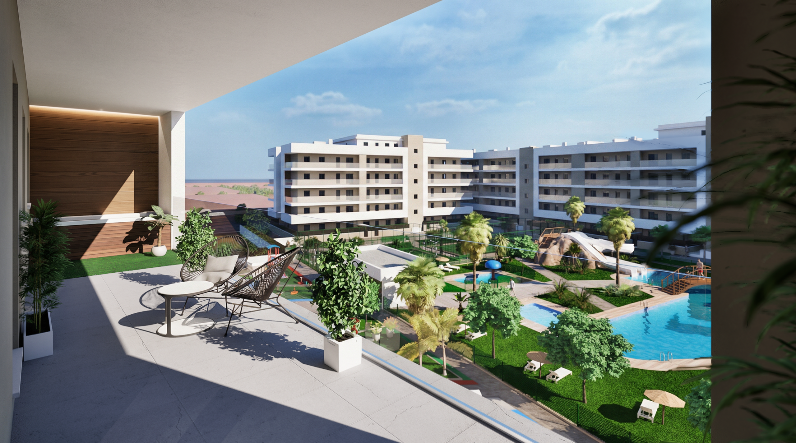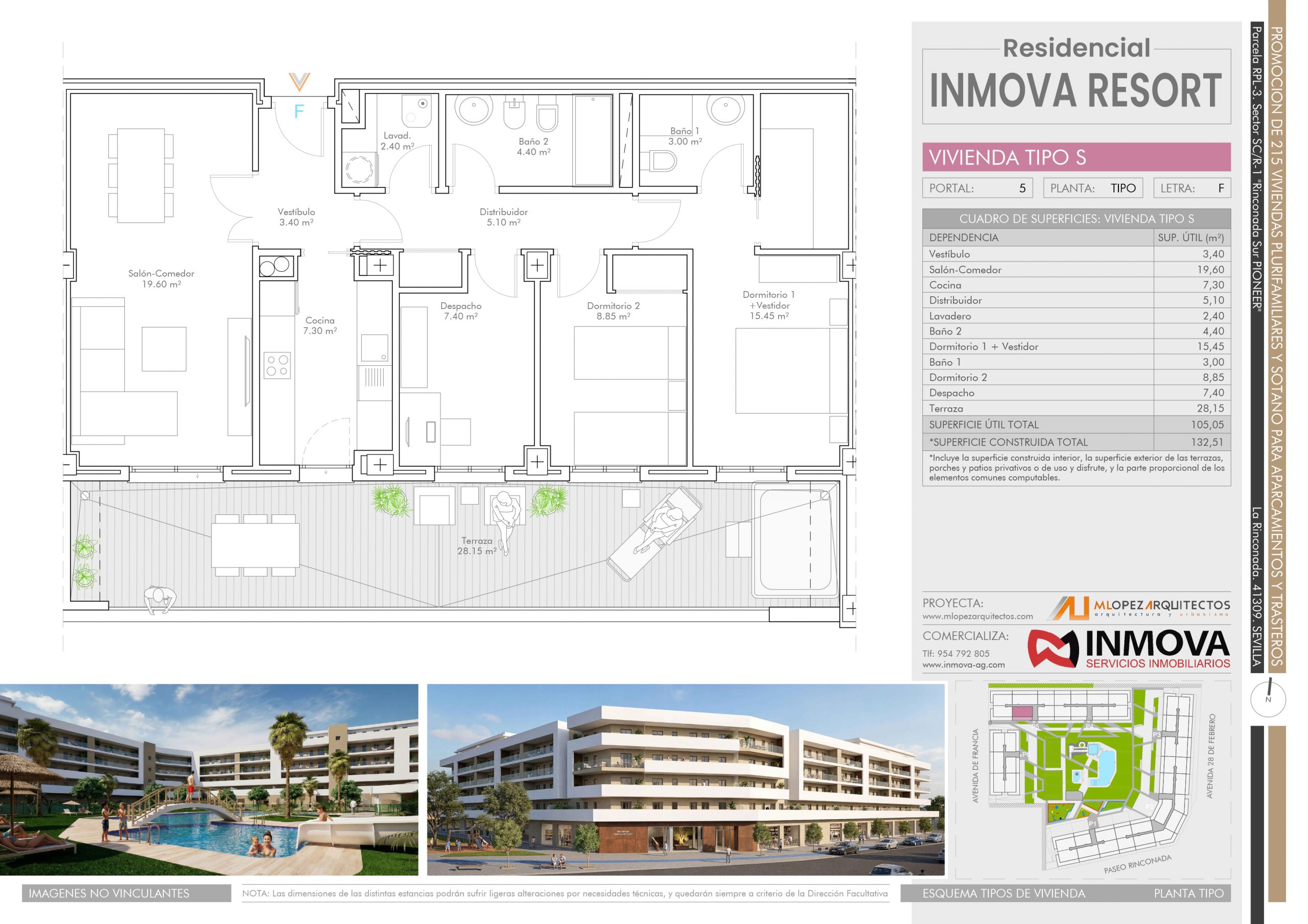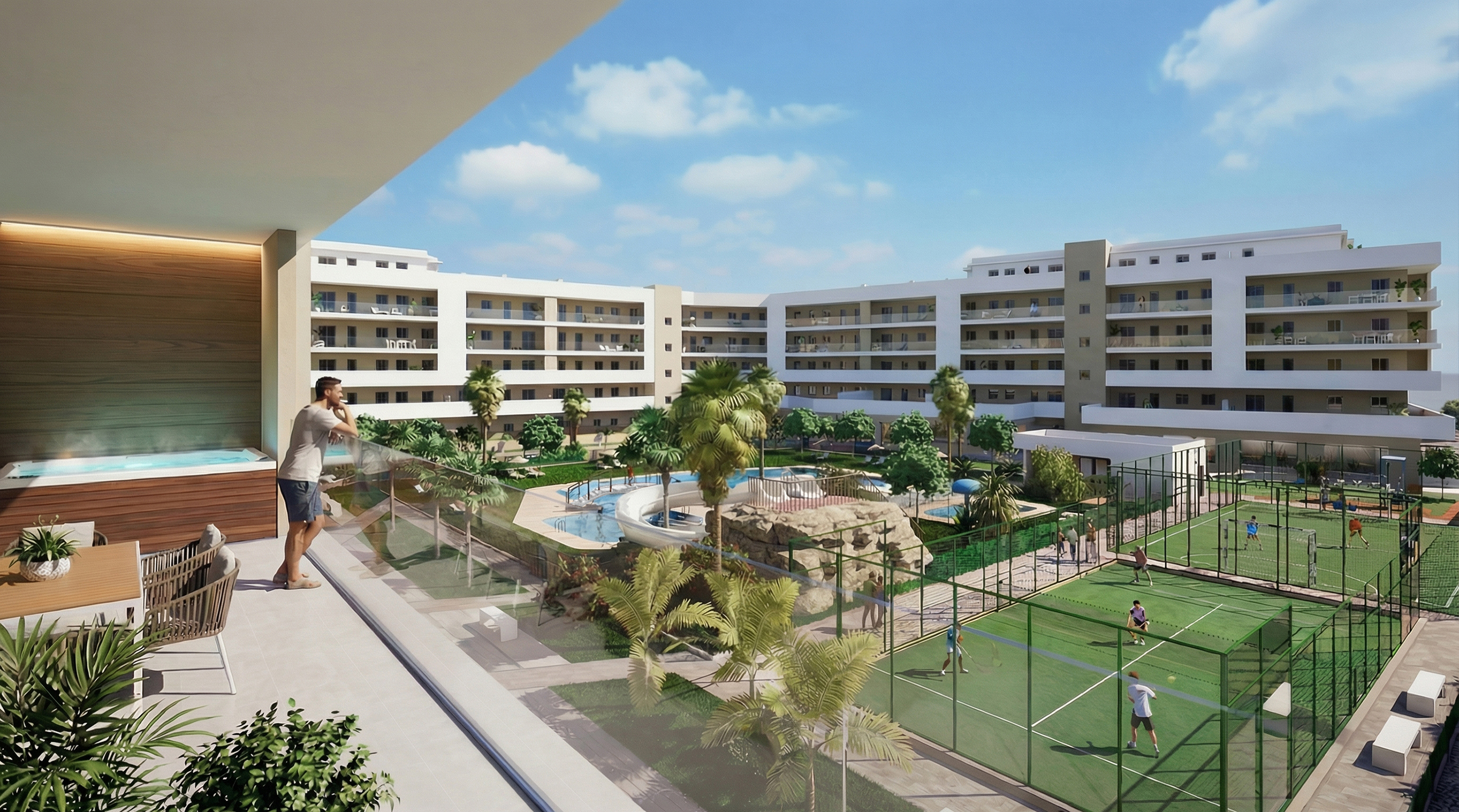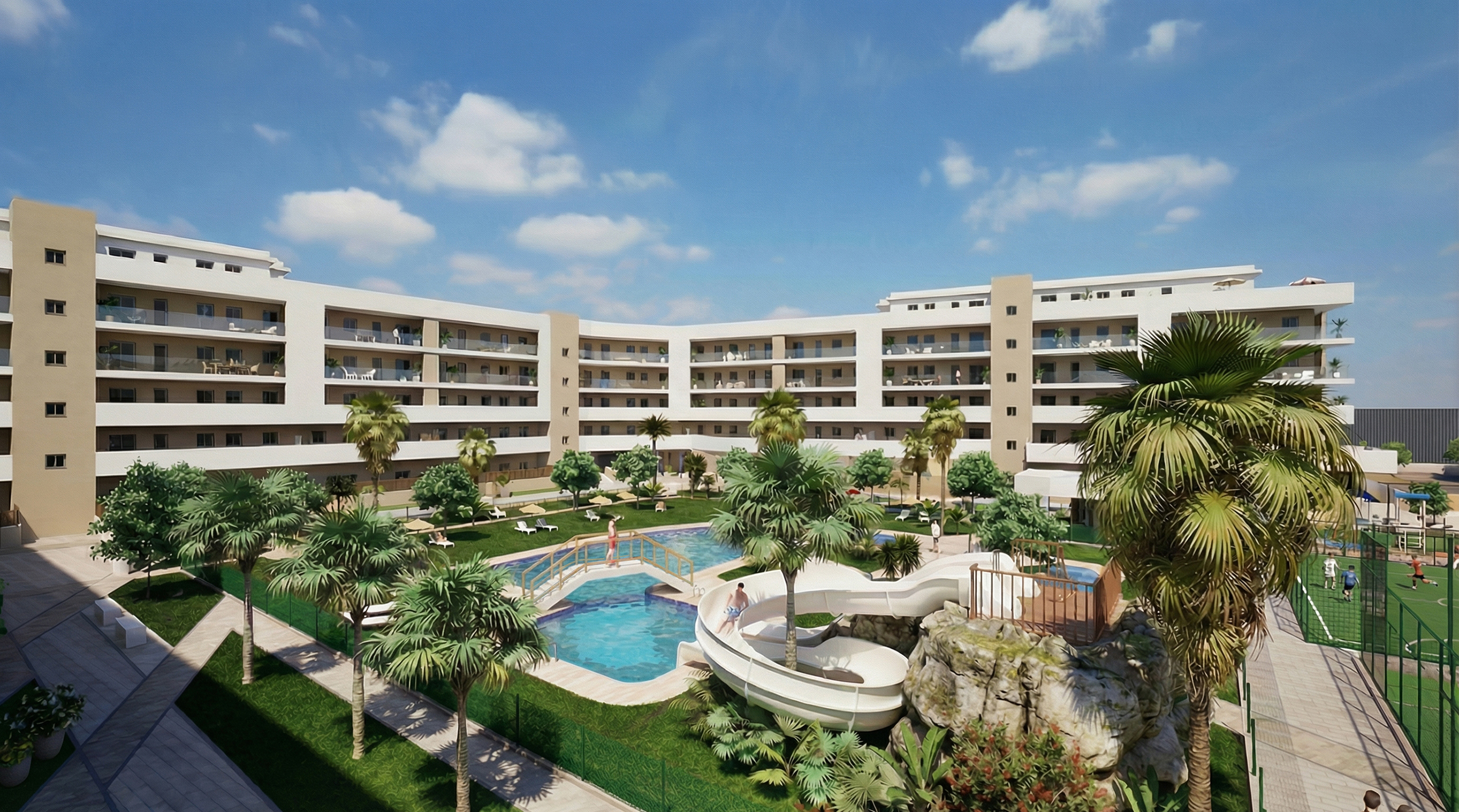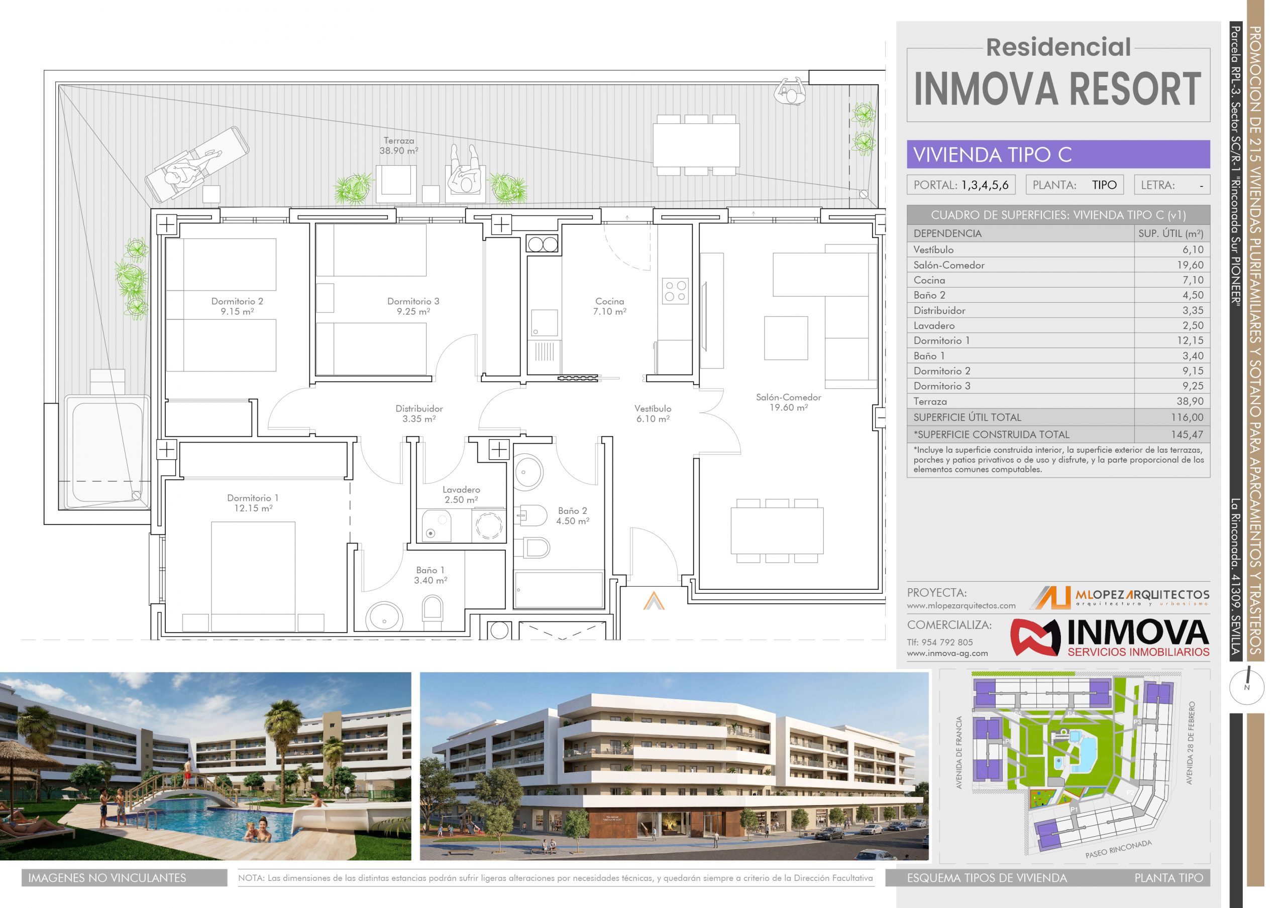 Nos satisface presentaros la nueva promoción Residencial INMOVA RESORT, un complejo urbanístico privado con parcela de 14.086m2, compuesto de 217 viviendas plurifamiliares, viviendas desde 1 dormitorio a 4, con dormitorio principal tipo suite con baño y grandes terrazas exteriores con ZONA DE JACUZZI.