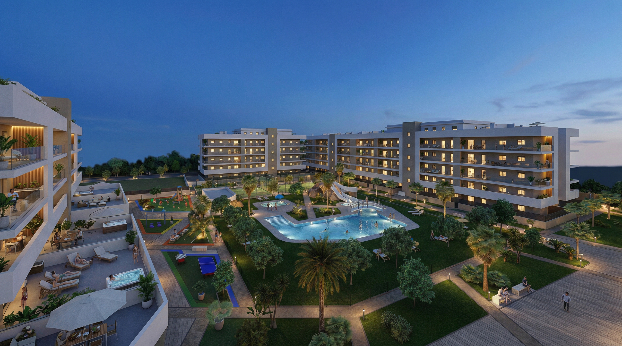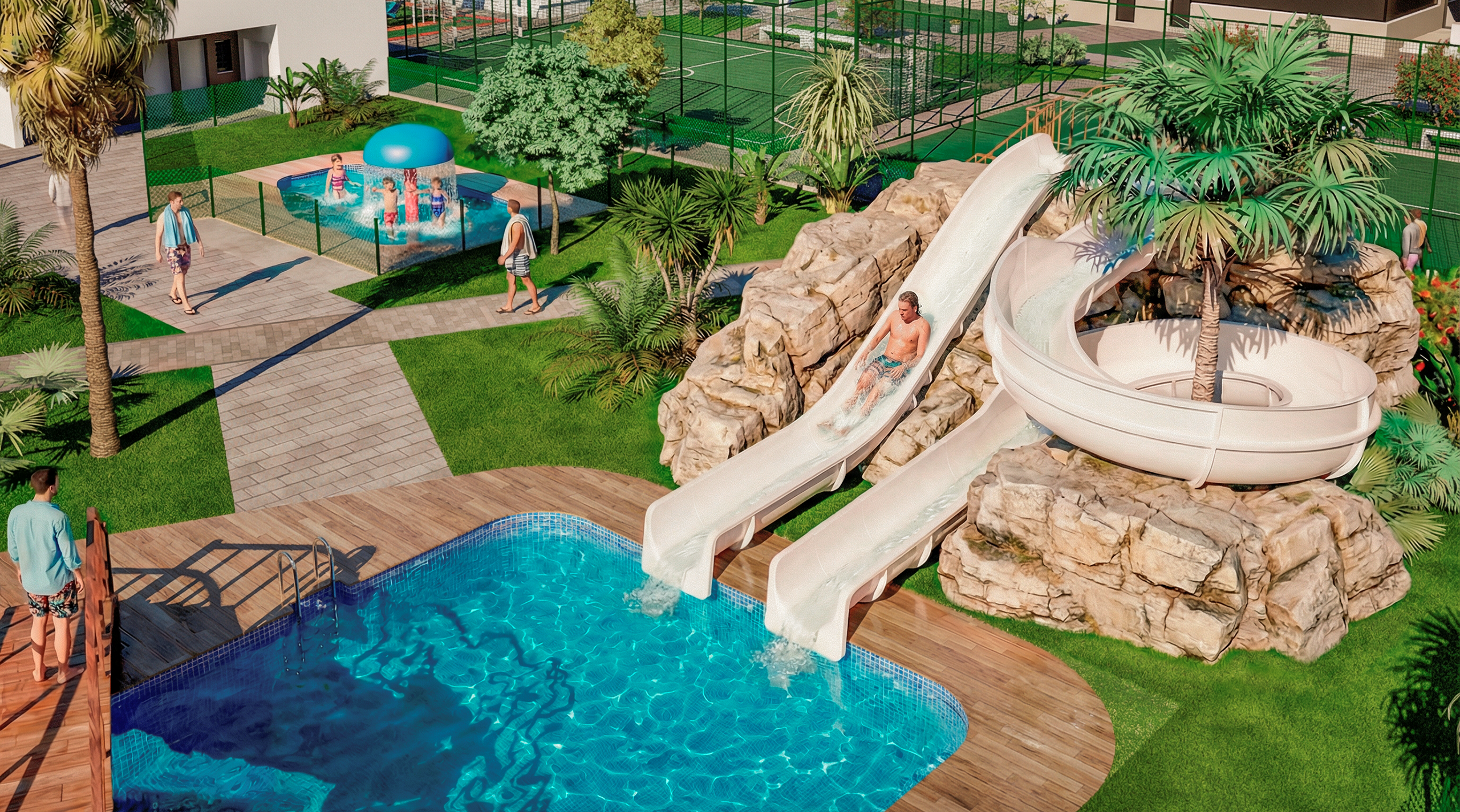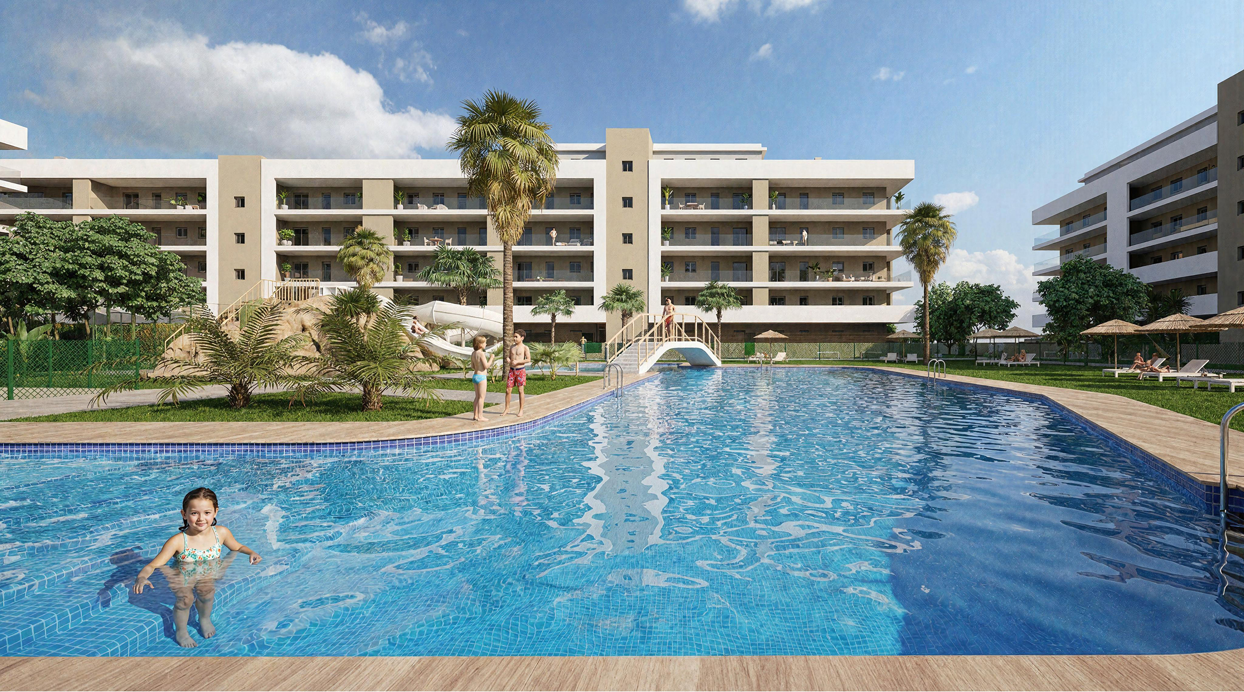 - Piscinas para adultos e infantil de agua salada, rodeadas de césped natural e iluminadas, con PUENTE, TOBOGANES y PALMERA LLUVIA.