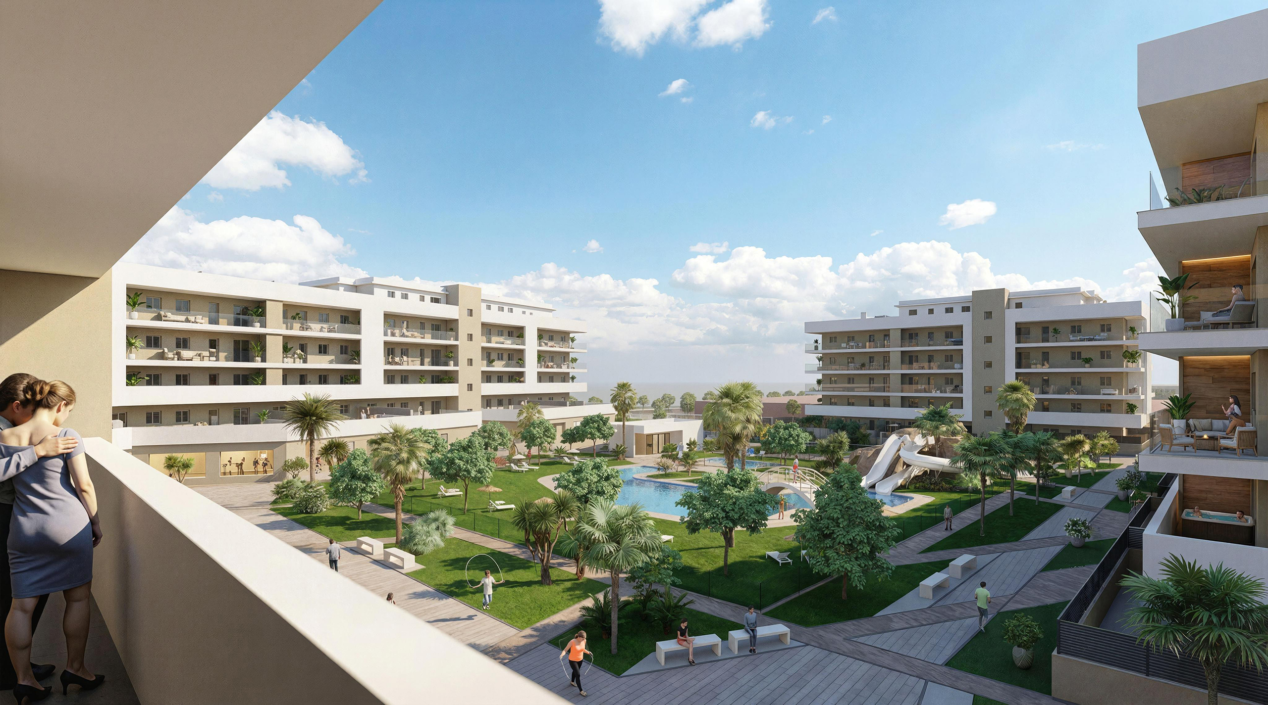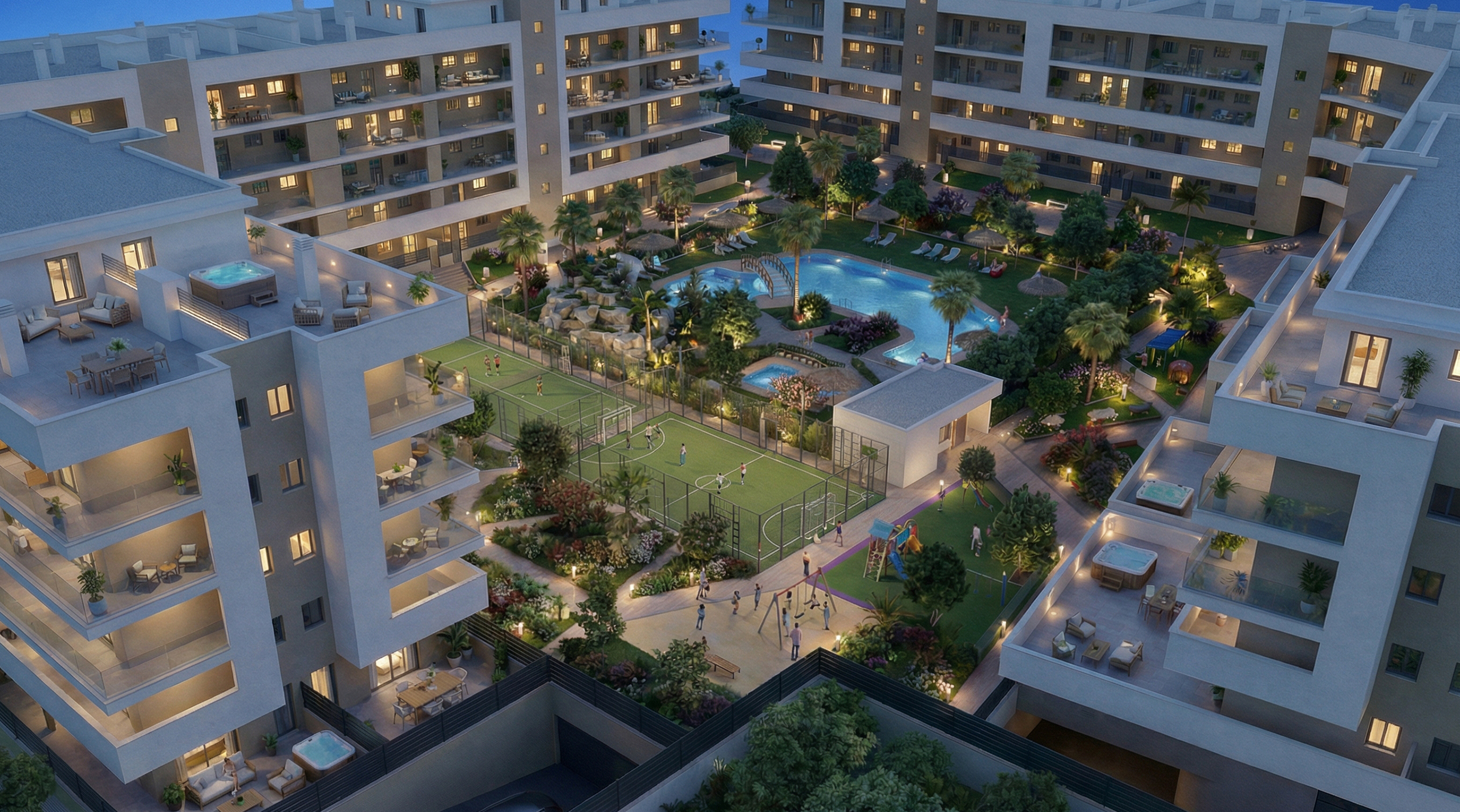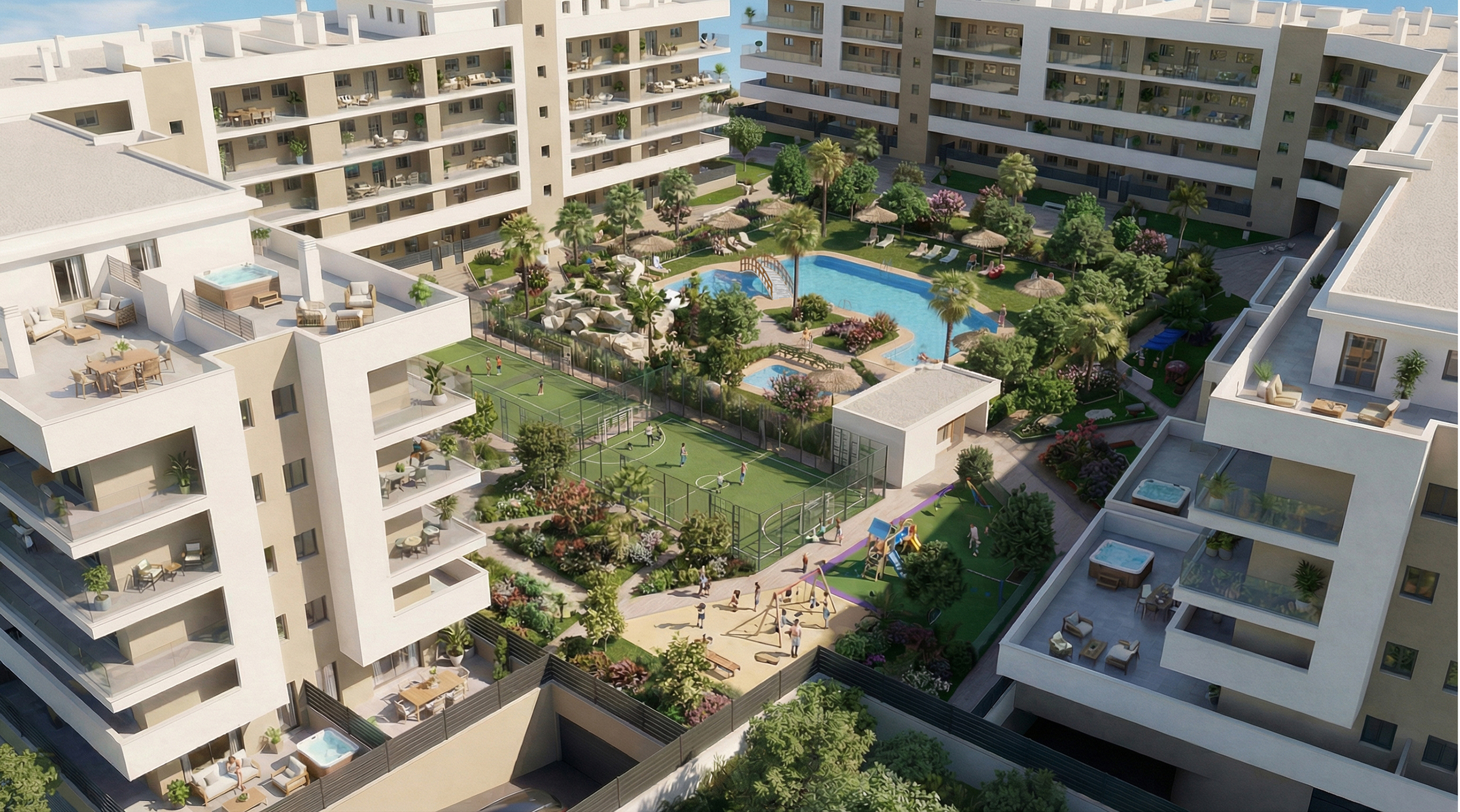 Nos proponemos dar valor a un nuevo concepto que hemos denominado “ VIVIR DE VACACIONES “, donde poner en práctica una nueva forma de vida con menos estrés y más enfocada al ocio, deporte y diversión, debido a que todas las viviendas podrán disfrutar en el mismo residencial, de 7.500 m2 de zonas comunes;
