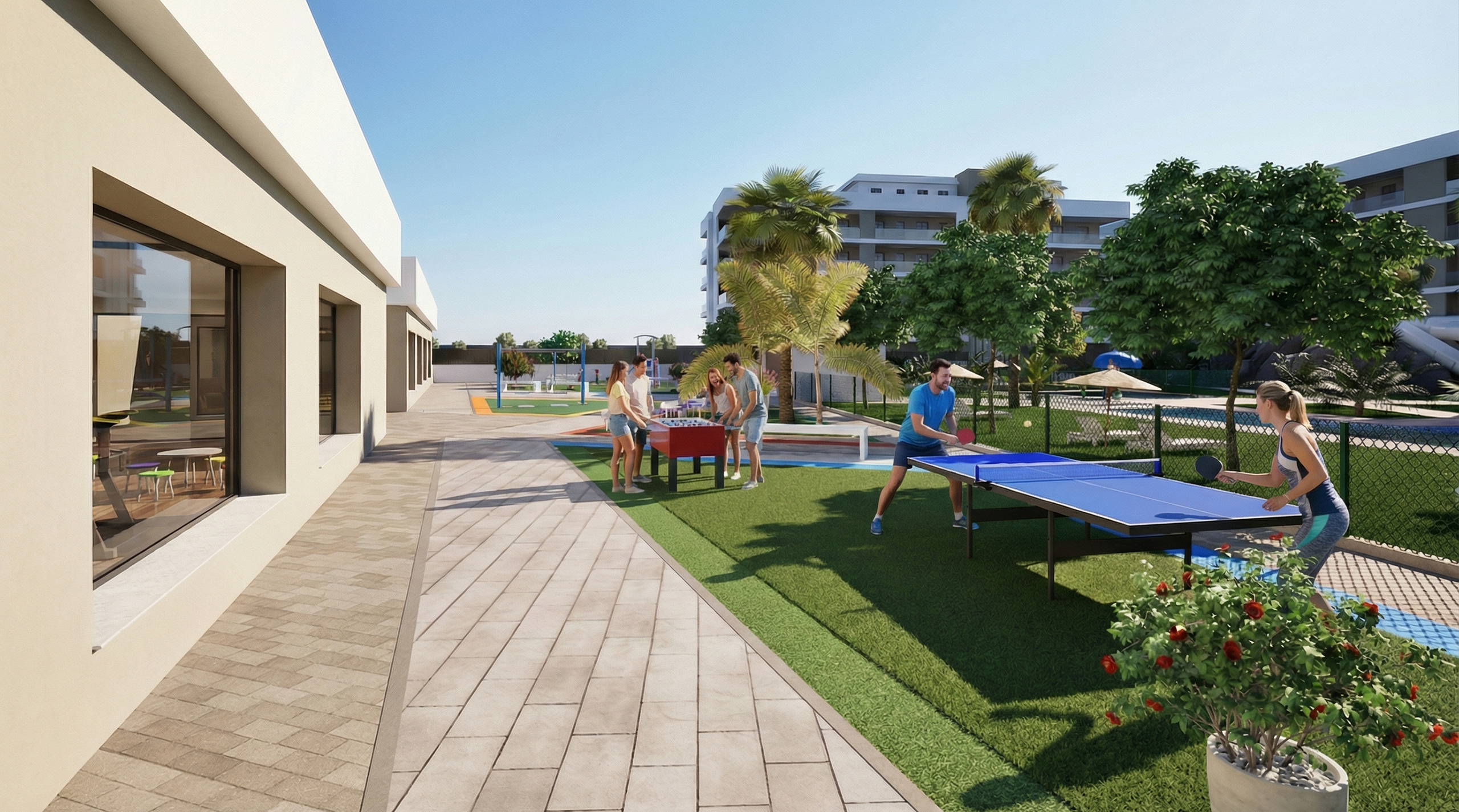 - Área de juegos exterior con PING PONG, FUTBOLÍN y mesas de juego.